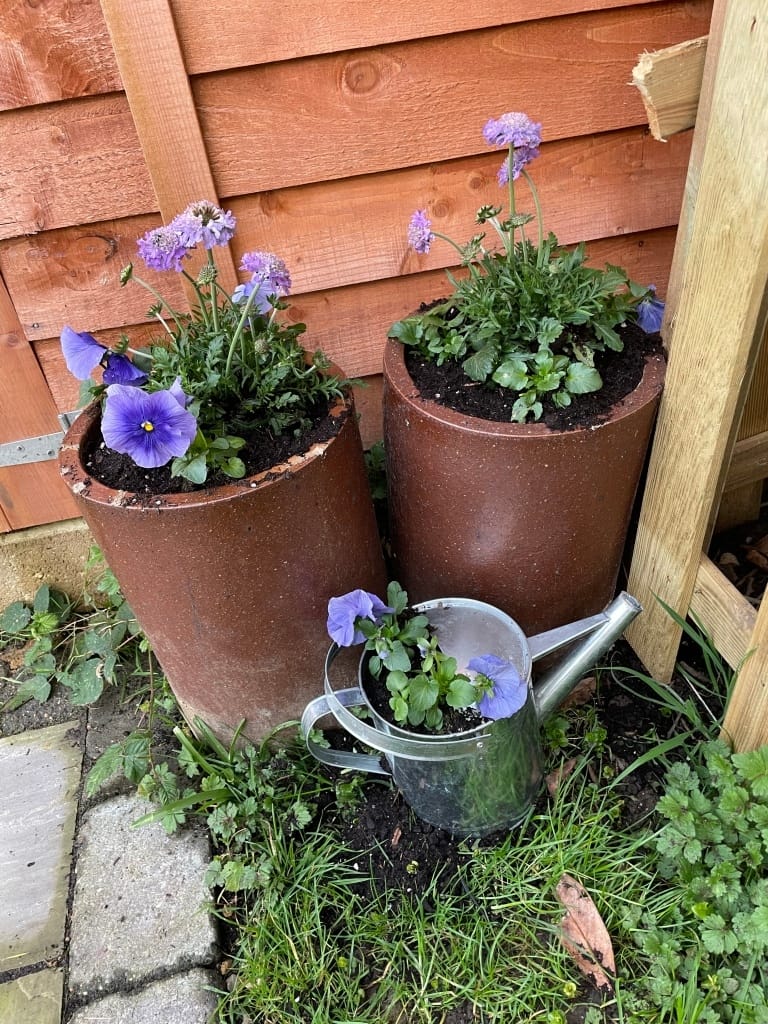 Since me and my wife Karen finally bought our own place last year, my task has been getting the garden sorted. This year, I have started planting some of the borders with wildflowers and installing new fences. The wildflowers are only starting to come through now. I also took some old chimney pots and an old watering can I found in the shed, and have planted them, and they look lovely!